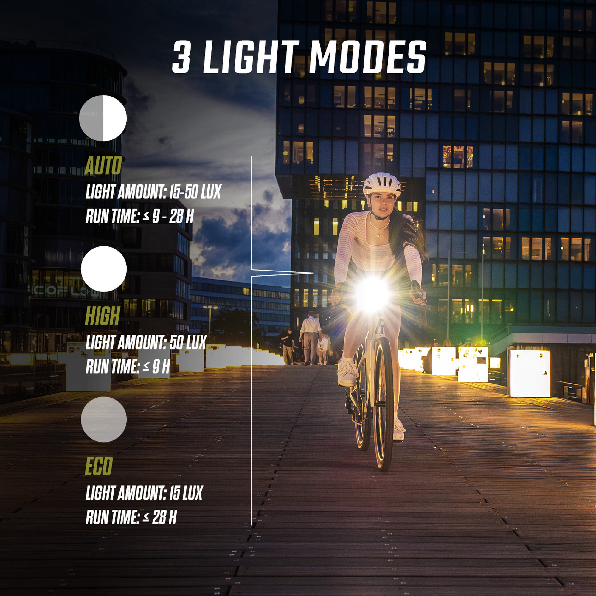 - AUTOMATIC LIGHT ADJUSTMENT The AURA 50 thinks for itself: In auto mode, an integrated brightness sensor automatically adjusts the light intensity depending on the ambient light. This means you always ride with the optimum lighting and use the battery particularly efficiently.