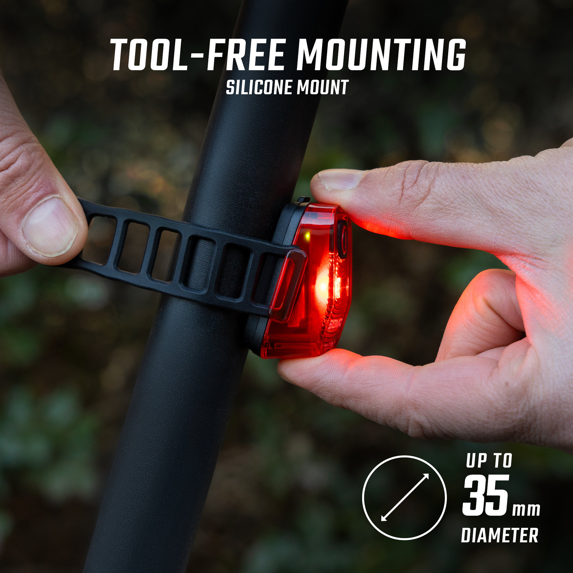 - MOUNTED QUICKLY Particularly practical: you dont need any tools to mount the NYTE 10. The flexible silicone strap makes it easy to attach to all standard seat posts in a matter of seconds.