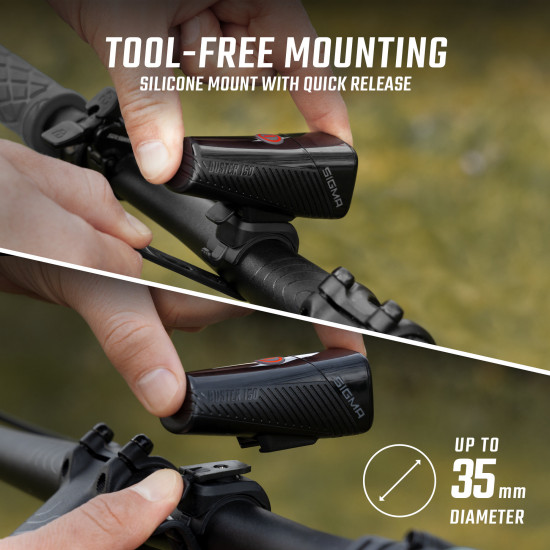 - MOUNTED IN SECONDS The BUSTER 150 can be mounted on the handlebars in a matter of seconds thanks to the silicone bracket. It can be positioned horizontally or vertically as needed so that it can be perfectly positioned for curved handlebars. The power light has a quick release so that it can be stowed quickly and compactly. The integrated slider allows the BUSTER 150 to be pushed on and removed conveniently. The SIGMA bike bracket fits on handlebars of 22-35 mm diameter.
