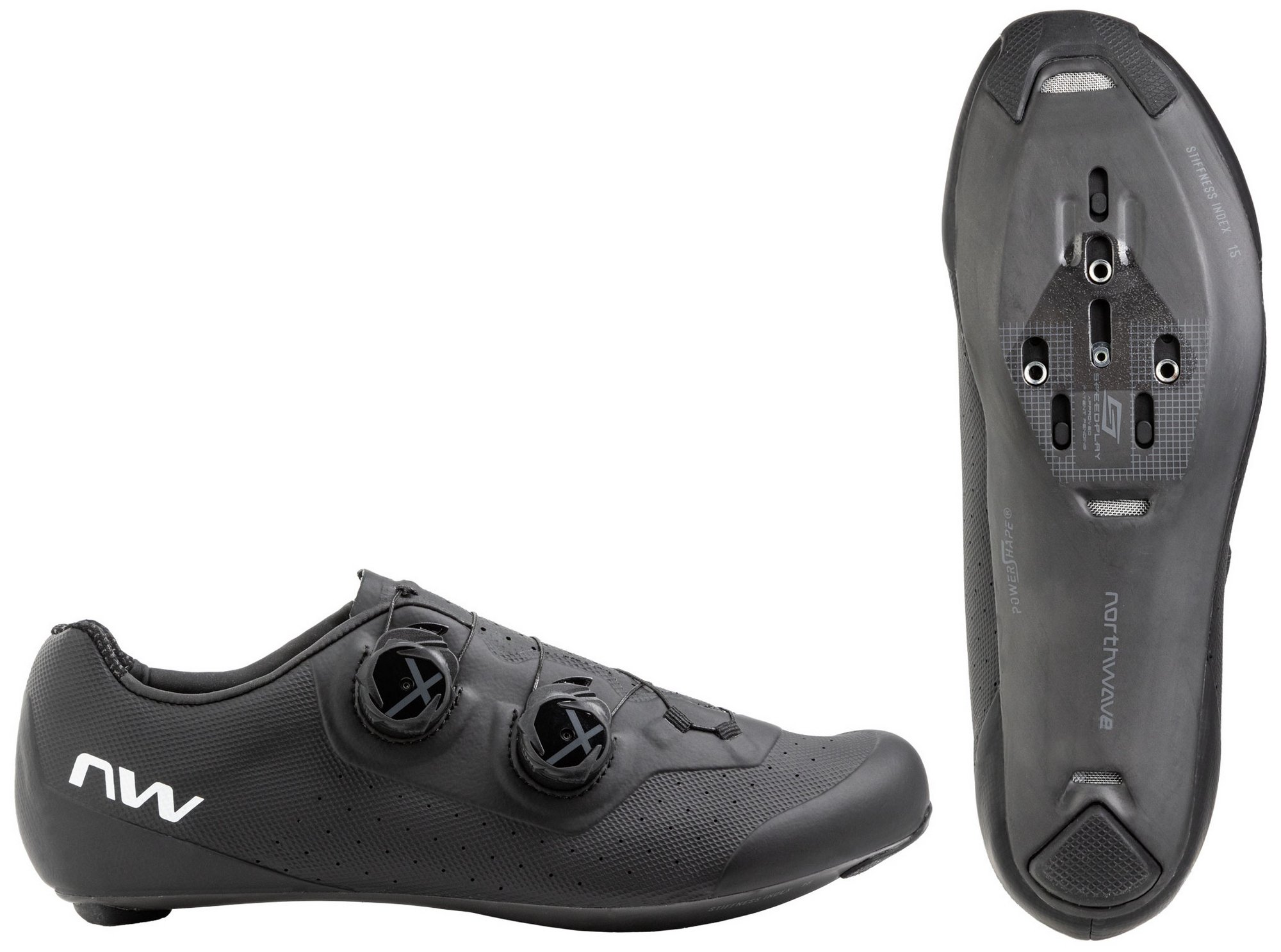 POWERSHAPE CARBON 15 Made from 100% unidirectional carbon, it has been developed to ensure 100% of rider power is transferred to the pedals without wasting any energy. The secret lies in the exclusive patented PowerShape system for the arch; dozens of prototypes were created to find the perfect shape and thicknesses to adapt to all feet and arches. It also has a special adaptor, so is compatible with Speedplay pedals.