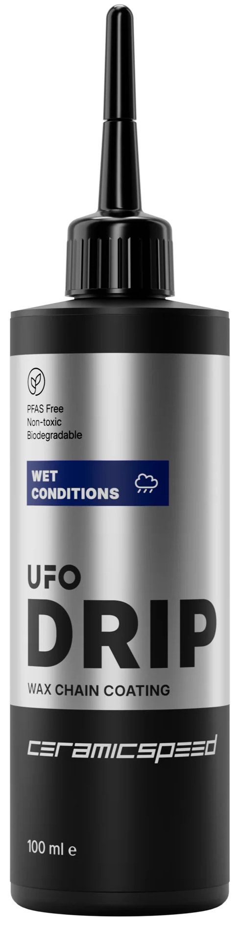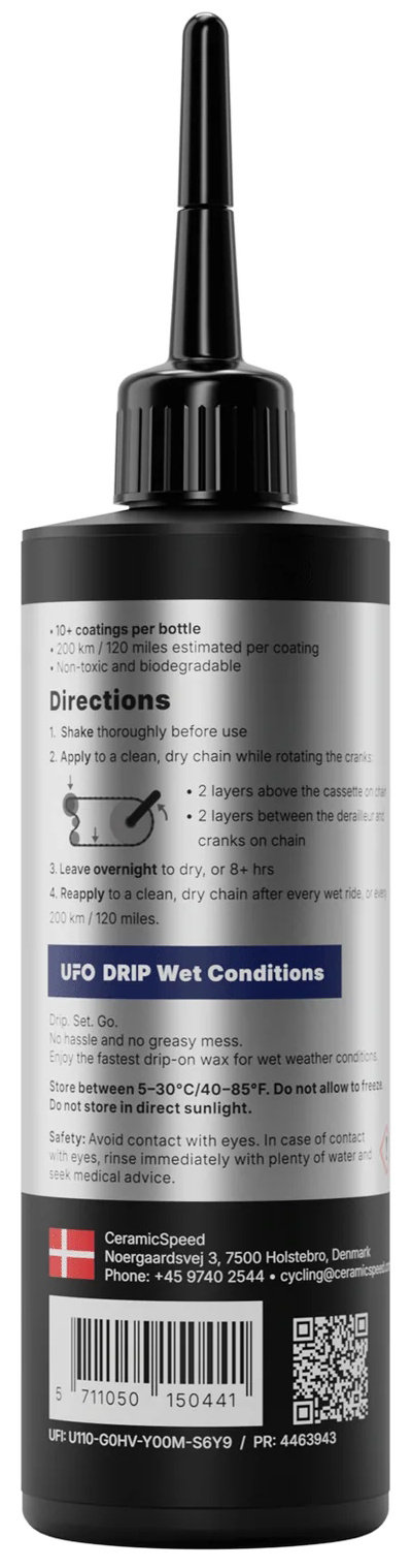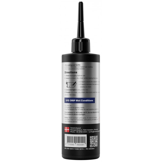 UFO DRIP Wet Conditions liquid wax chain coating is specifically formulated to lubricate and protect your chain in rainy, wet, and high-moisture environments, ensuring your chain stays fast and clean no matter the conditions. It provides strong water resistance and durable protection, helping riders keep their drivetrain efficient and protected during challenging weather.