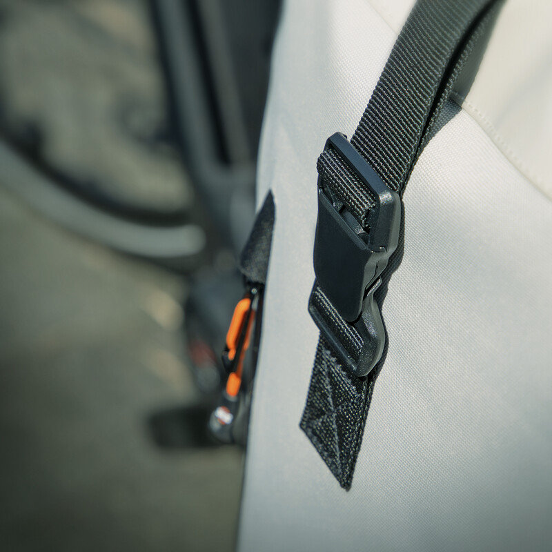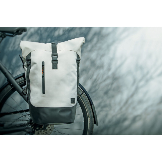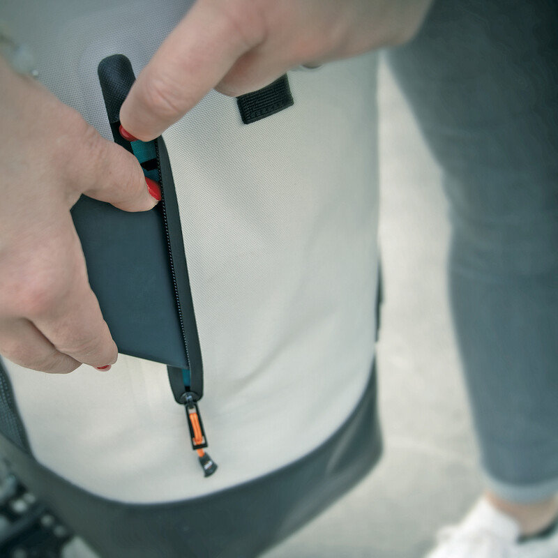 The roll-top with zipper and magnetic clip makes the INFINITY URBAN SIDEBAG flexible and adjustable in size. High-quality materials made from waterproof fabric and welded zippers protect the contents from wind and weather. Other features include the padded laptop compartment (up to 15"), the reinforced back and bottom of the bag, a quick-access outer compartment and sewn-in reflective strips on the sides. The side bag can be removed from the carrier in a single movement and used as a shoulder bag thanks to the shoulder strap.