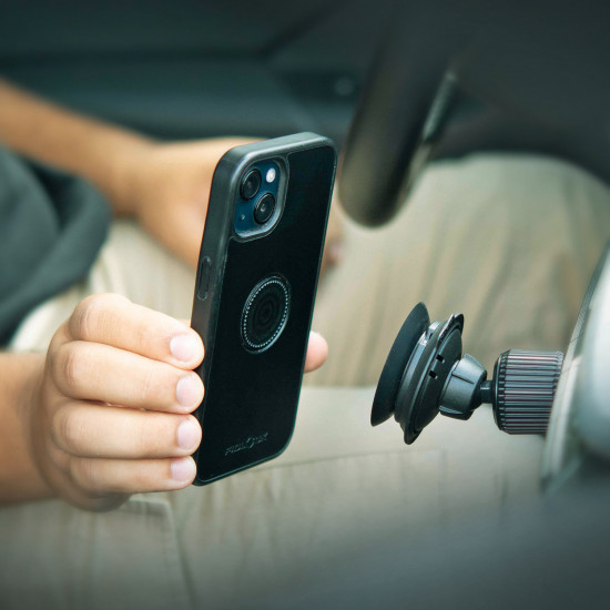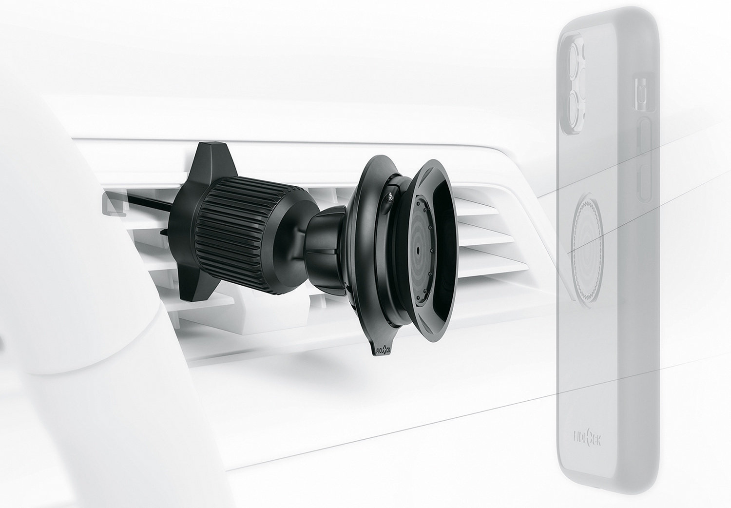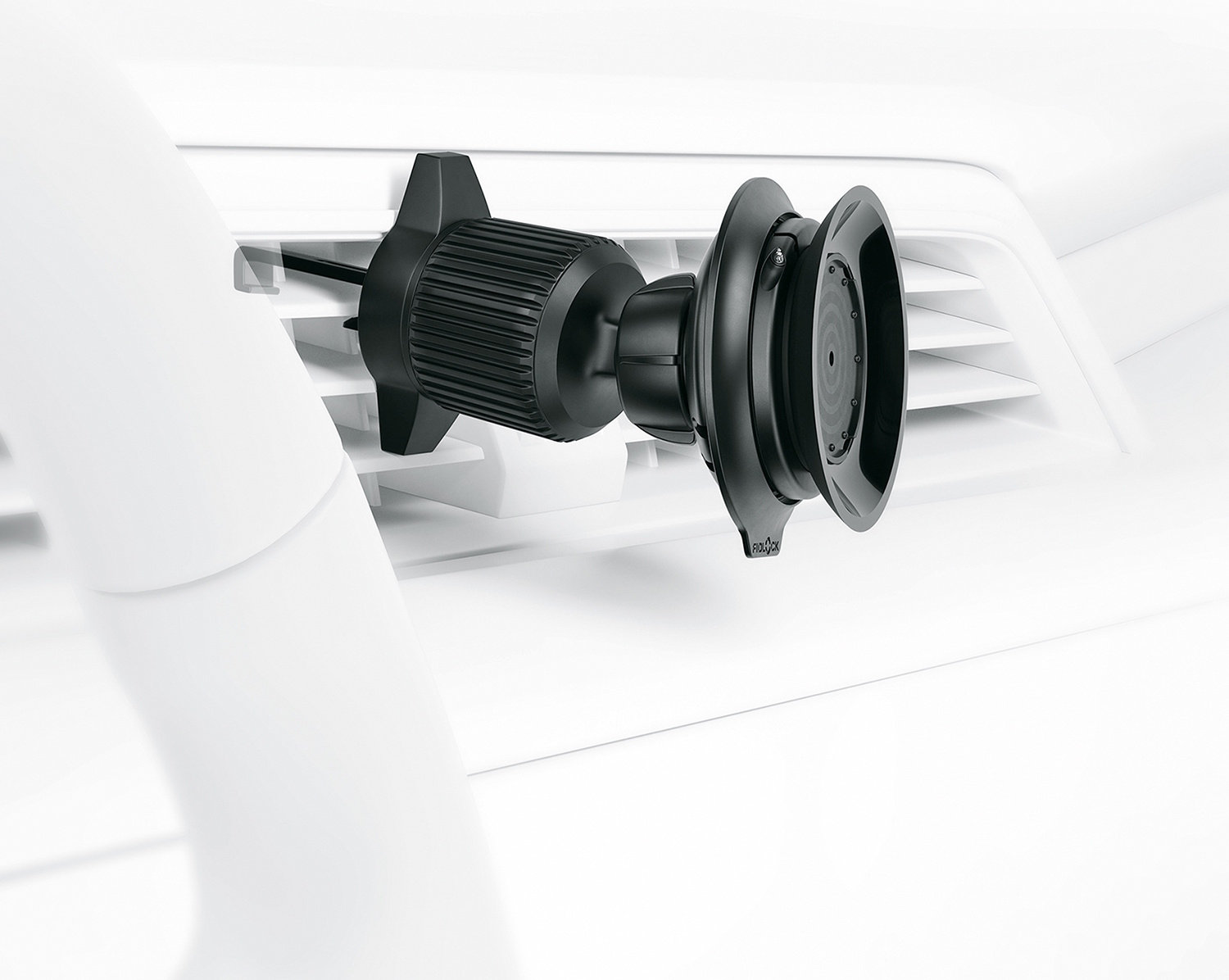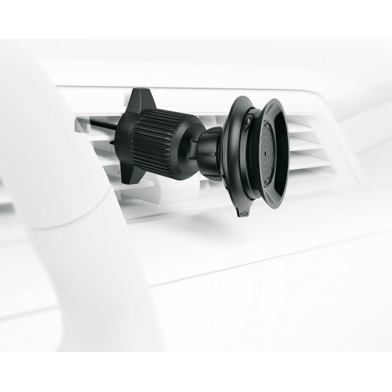 The VACUUM car vent base consists of a magnetic suction cup with an operating lever and ball head. A hook that is clamped into the ventilation panels and fixed with a locking ring ensures a secure hold.