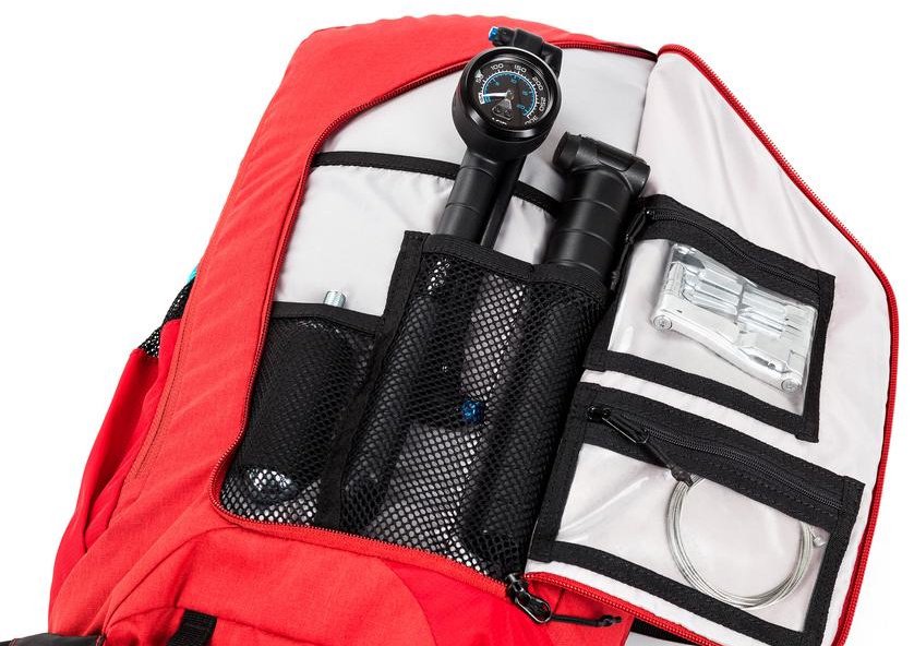 Perfect timing. The cloud cover rips open and the sun shines through the tree tops at the start of my favourite trail. In the beginning it still flows through the spruce forest, but further down it gets technical and steep. If worst comes to worst, the spare tube and pump are easily accessible in the perfectly organised tool compartment. And then the nasty drop at the crux. It's a good feeling knowing that my back is optimally protected by the integrated SAS-Tec protector.