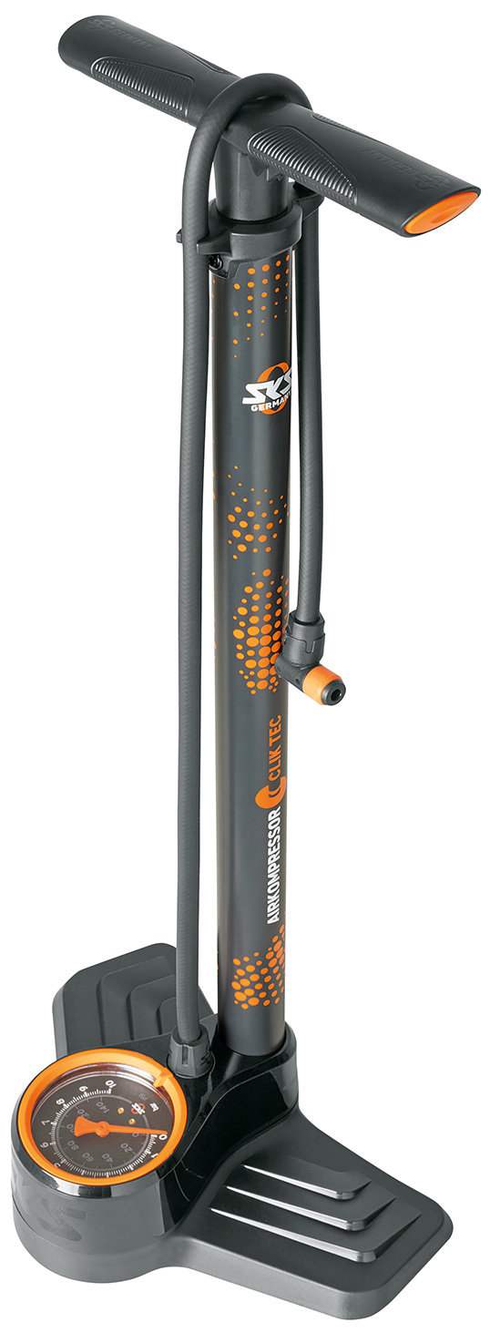 The AIRKOMPRESSOR CLIK TEC 10.0 stands for efficient pumping performance and innovative technology. Specified with the SKS CLIK TEC pump head, the floor pump is optimally matched to the Schwalbe Clik Valve system. The valve head can be operated effortlessly with just two fingers and prevents pressure loss when pumping. The volume flow is 50 % higher than with conventional SV valves.