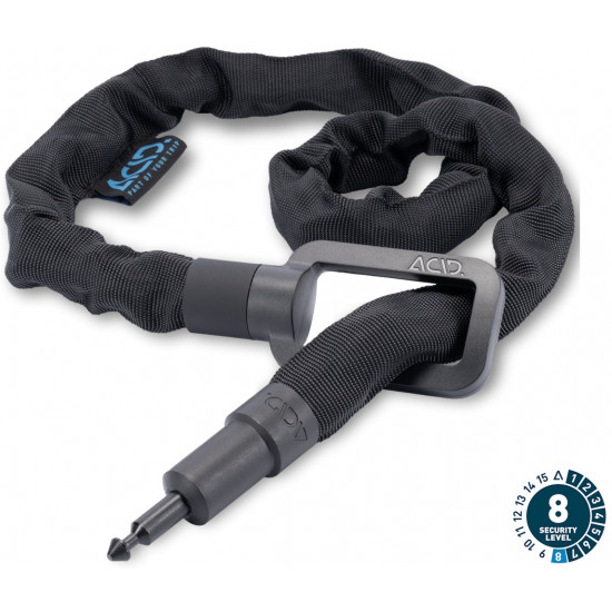 You don't just want to lock your bike with a frame lock, but also connect it somewhere for more security? The solution: the acid plug-in chain for the acid latch 6078 frame lock, allowing you to additionally secure your bike to a fixed object and only need one key. The insert chain is quiet, extremely robust and wear-resistant. The soft plastic cover protects the frame from scratches. The acid pro 100 is 100 cm long, the pro 150 is also available with a length of 150 cm.