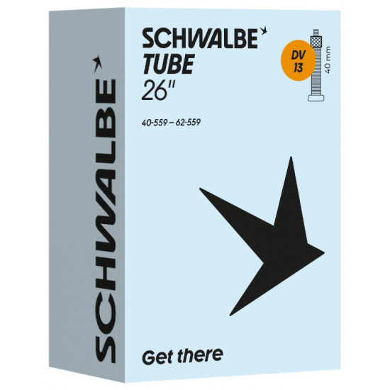 Schwalbe standard bicycle inner tube no. 13. For bicycle tires in size 26" inch (ETRTO 40/62-559). Retains air for longer than average. Thanks to the best material quality and uniform wall thickness. Maximum reliability that has proven itself millions of times over.