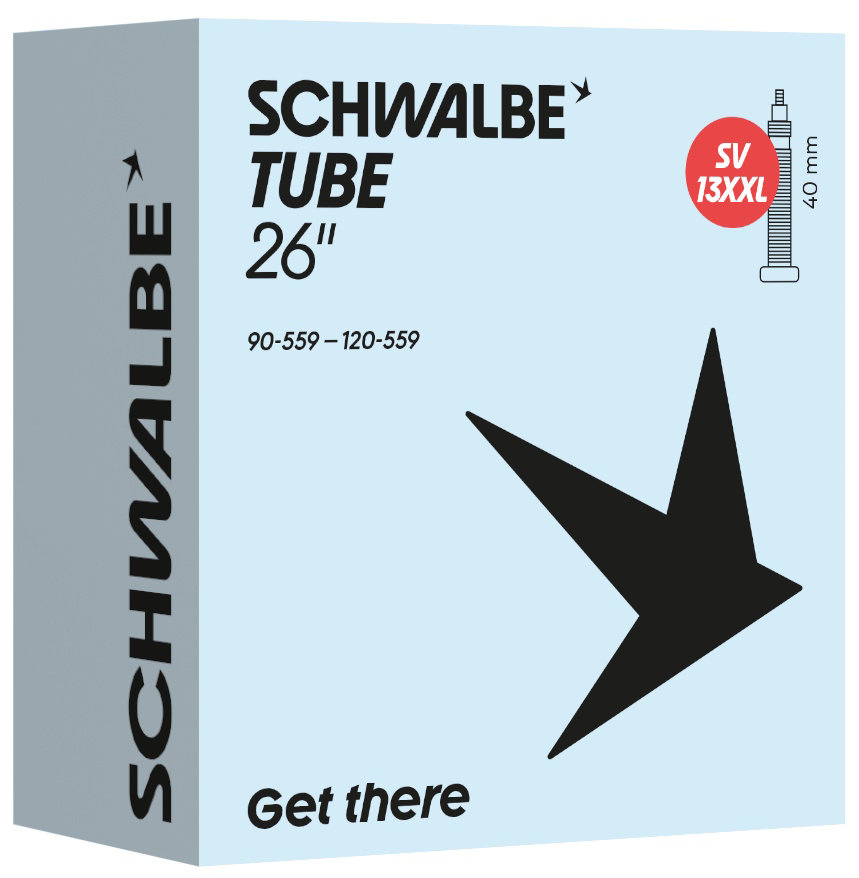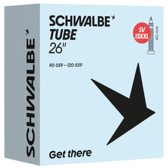 Schwalbe standard bicycle inner tube no. 13XXL. For bicycle tires in size 26" inch (ETRTO 90/120-559). The Schwalbe inner tube especially for fat bikes, with huge volume. For fatbike tires up to 120 mm wide. Retains air for an above-average length of time. Thanks to the best material quality and uniform wall thickness. Maximum reliability that has proven itself millions of times over.