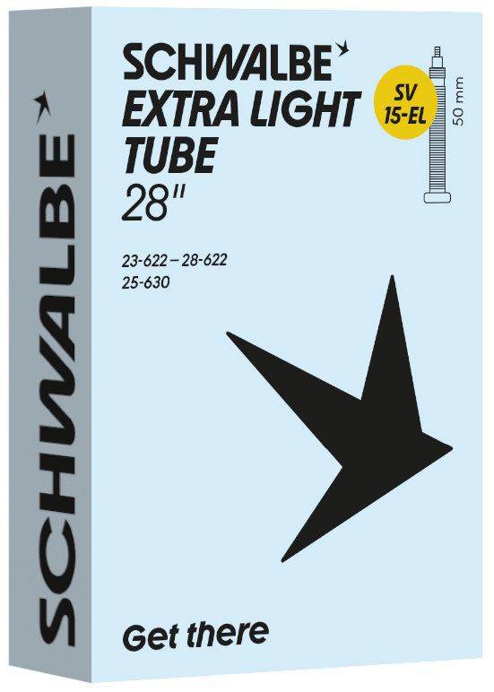 Schwalbe EXTRA LIGHT bicycle inner tube no. 15-EL. For bicylce tires in 28" inch (ETRTO 23/28-622, 25-630). Lower weight, with the same reliability as a Schwalbe standard inner tube.
