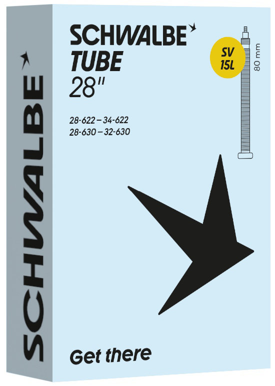 Schwalbe standard bicycle inner tube no. 15L. For bicycle tires in size 28" inch (ETRTO 28/34-622, 28/32-630). Holds air for an above-average length of time. Thanks to the best material quality and uniform wall thickness. Maximum reliability that has proven itself millions of times over.