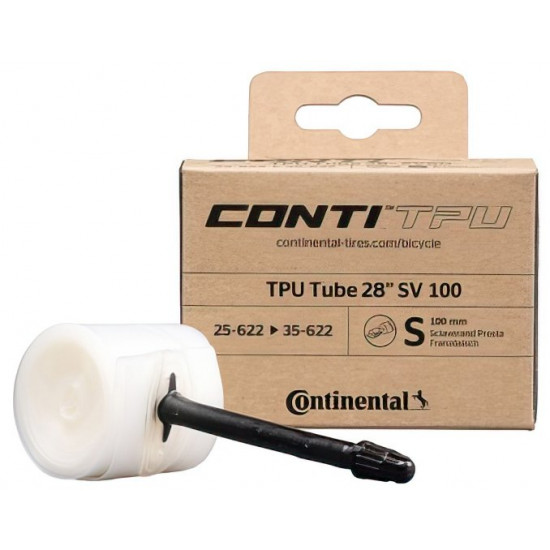 The seven-layer, lightweight and space-saving TPU tube from Continental for performance-oriented road riders. ContiTPU is premium, lightweight yet durable and suitable for both road and off-road riders. The highest grade of micrometer-thick TPU deployed across seven sealed layers maximises airtightness and durability. The tubes are uncoloured to further ensure the highest material quality and prevent air retention issues caused by dye-related surface imperfections. Every ContiTPU tube is quality-checked post-production. The base of the valve shaft is slightly conical in shape to improve fit to the wheel rim and reduce unwanted movement, while the valve is internally threaded to allow for the use of valve extensions or a replacement valve core.