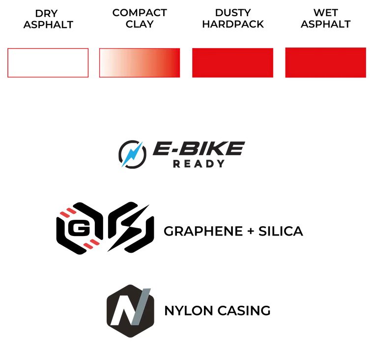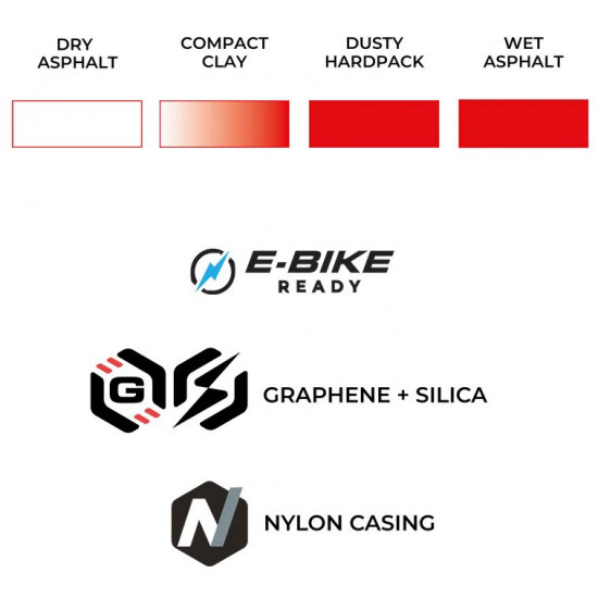 RACE FORMULATION POWERED BY GRAPHENE + SILICA This BMX-specific compound is engineered to deliver maximum speed and grip without compromise. The advanced blend of Graphene + Silica provides low rolling resistance for explosive acceleration, while ensuring confident traction through corners and transitions. Whether on pumptracks or race gates, this high-performance formulation keeps you fast, responsive, and in control when it counts most.