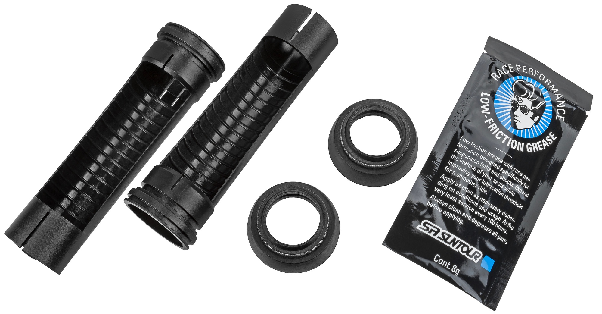Aprašymas - Purvo riebokšlių ir plastinikinių kreipiančiųjų komplektas SR Suntour for 25.4mm stanchions (FKA122-94)