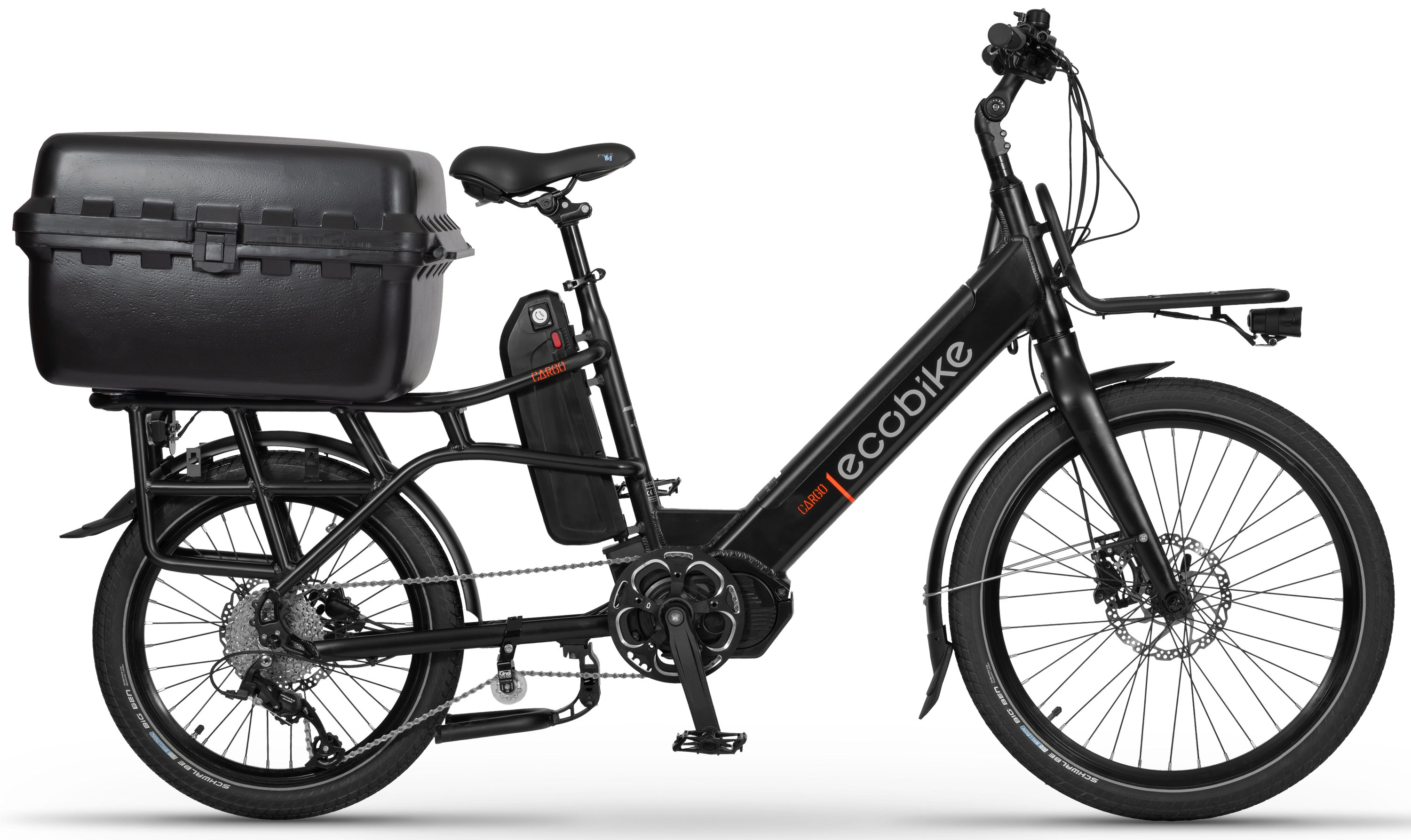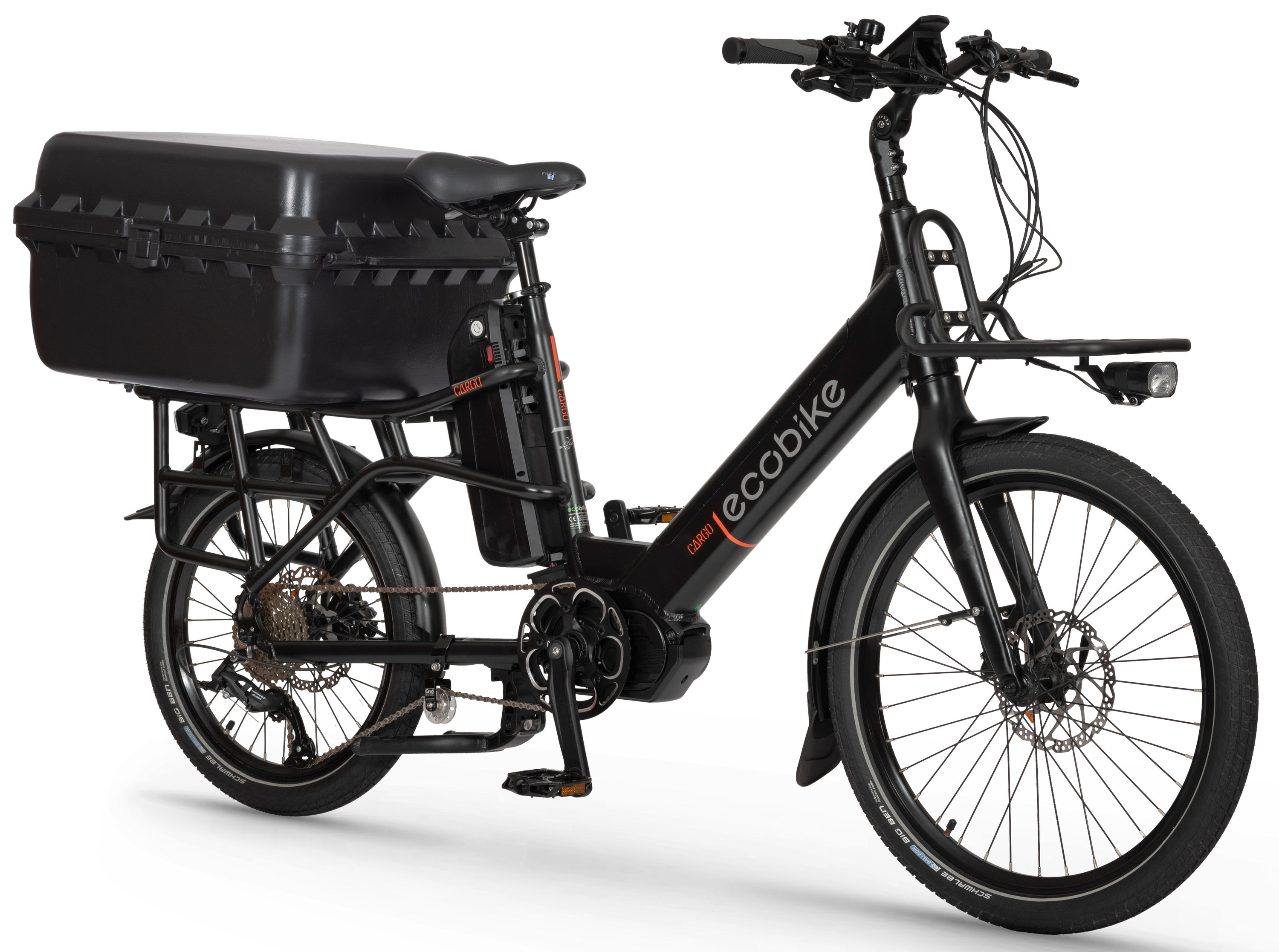 A bicycle for special tasks must include solid equipment. In the hardships, reliable solutions are needed. Therefore you'll find durable Schwalbe Big Ben Plus tires, a strong Microshift derailleur, and Shimano hubs in this bike. For your comfort and safety, the Ecobike Cargo is factory-fitted with complete lighting and fenders.