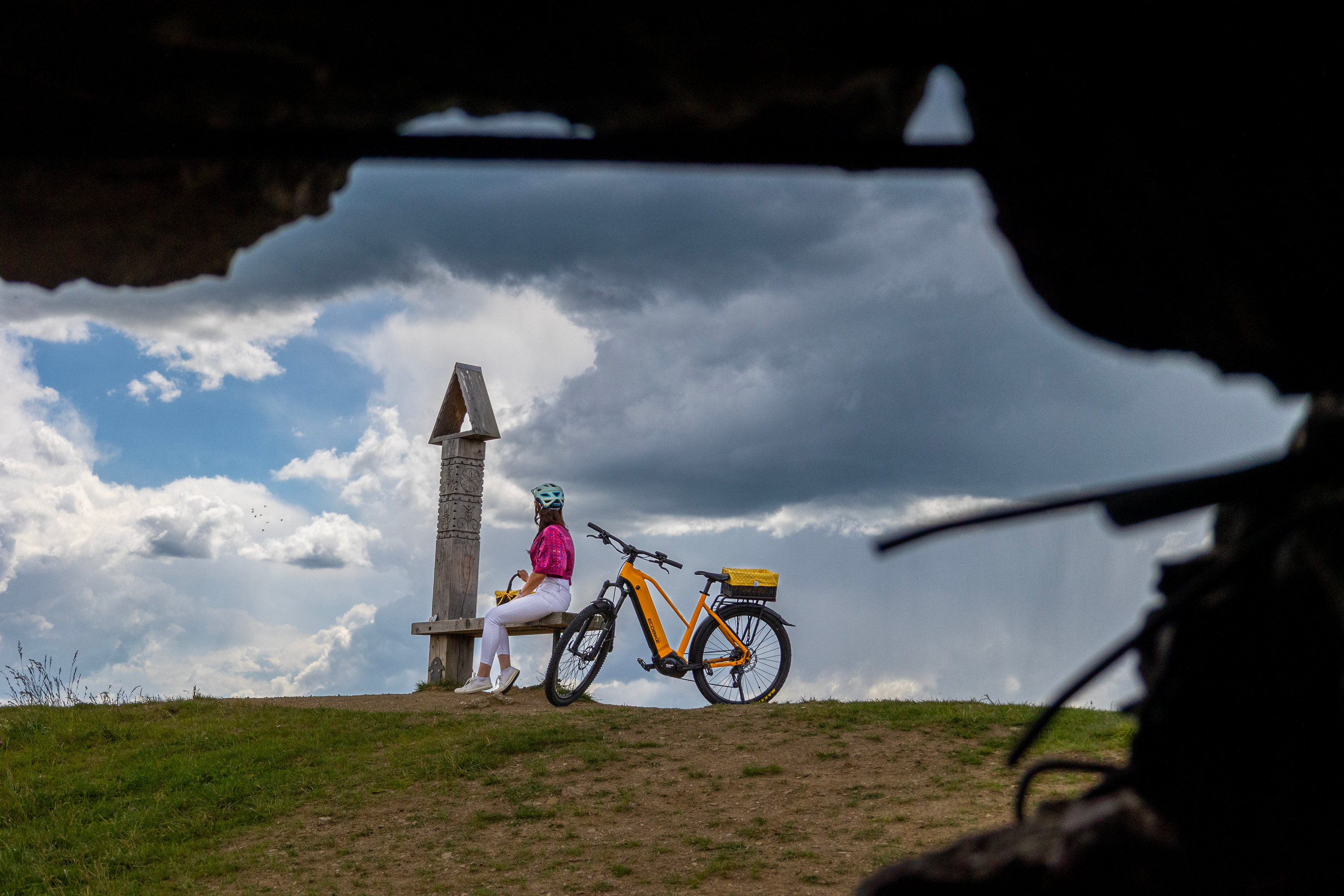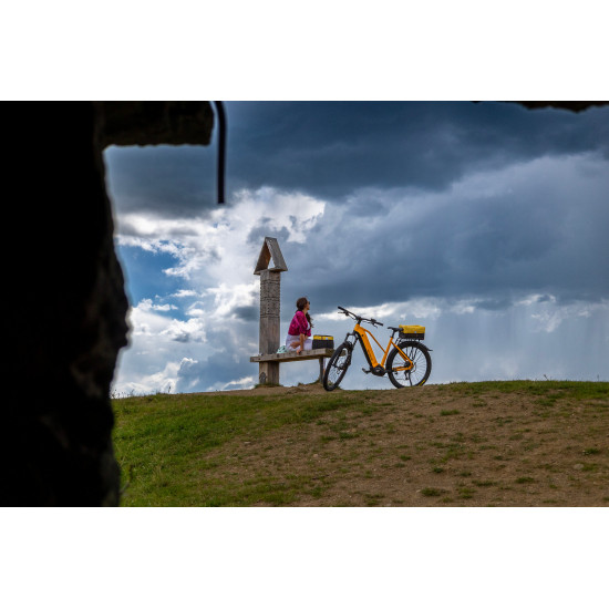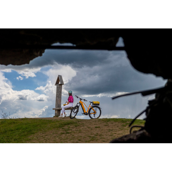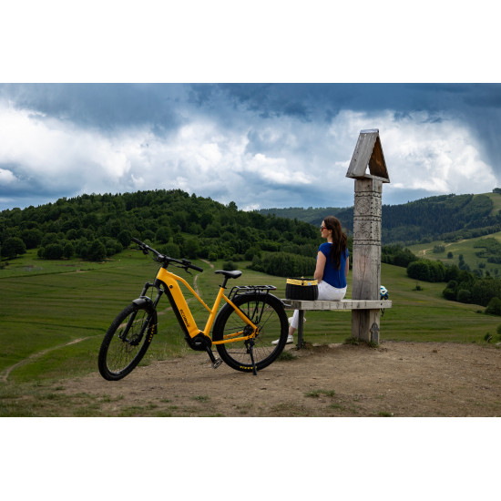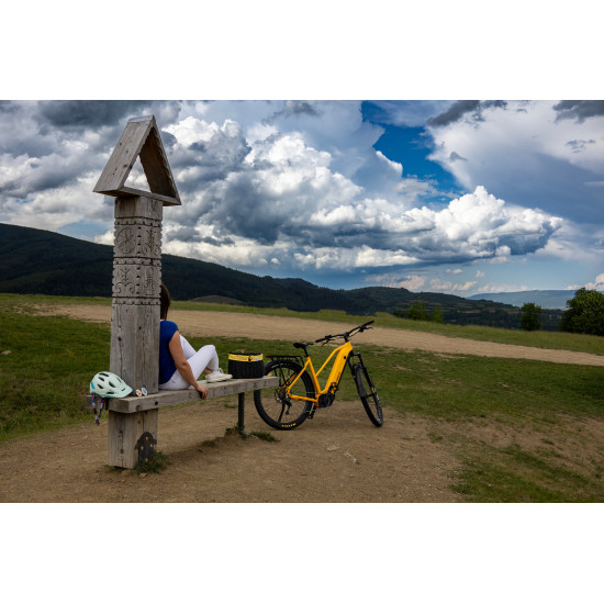 - Įmontuotas rėmo centre (išorėje, tarp galinio rato ir balnelio rėmo vamzdžio)