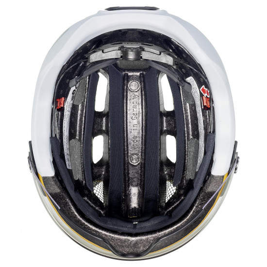 DVIGUBAI IŠLIETA ŠALMO KONSTRUKCIJA – Apsauginė EPS medžiaga įlieta tiesiogiai į polikarbonato kiautą ir iš apačios uždengta papildomu polikarbonato kiautu. Tokia technologija leidžia sukurti lengvą, tačiau itin tvirtą šalmą. Polikarbonato kiautas iš apačios suteikia papildomą apsaugą. EPS yra speciali medžiaga su mikroskopinio dydžio oro burbuliukais – efektyviai sugeria smūgio energiją, patiriamą nukritus.